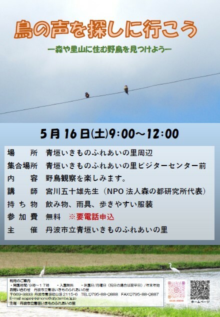 青垣いきものふれあいの里周辺で、先生のお話しを聞きながら、野鳥観察を楽しみます。