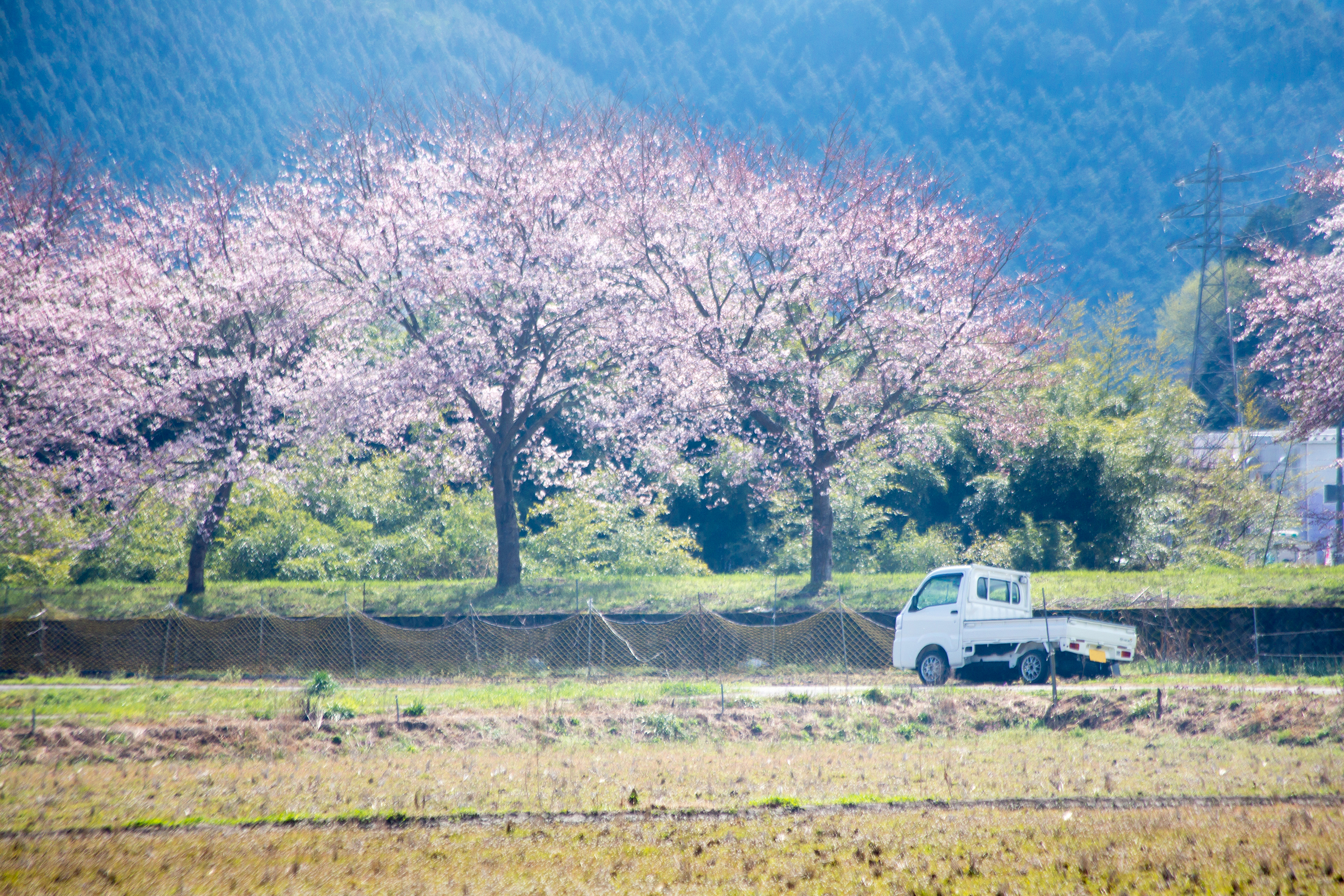 桜を眺める軽トラくん_佐治川