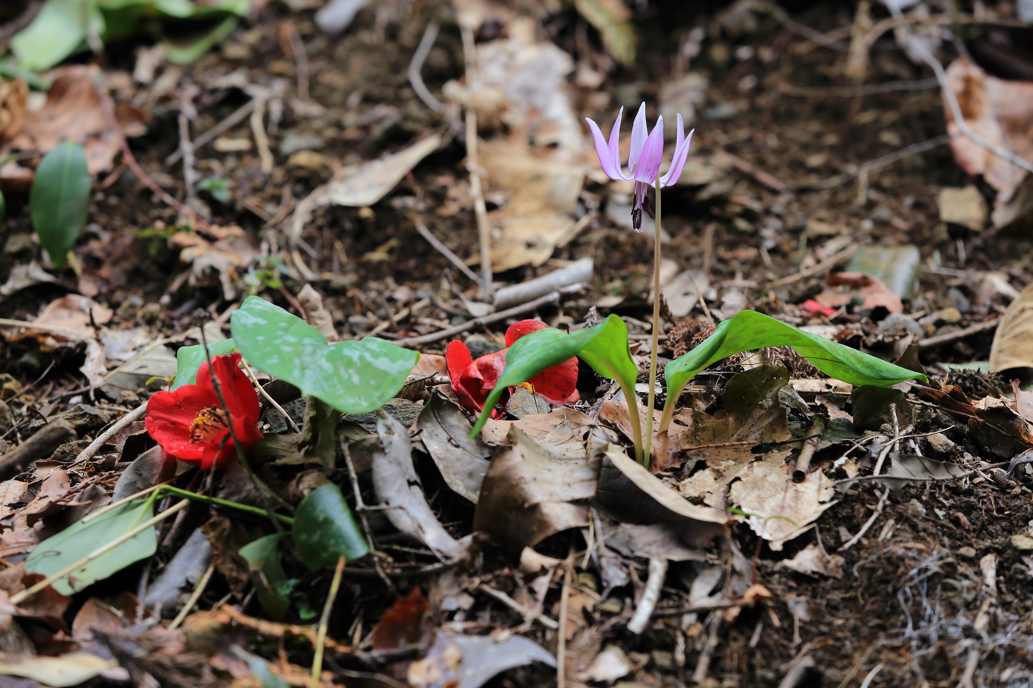 カタクリと椿の花_清住かたくりの里
