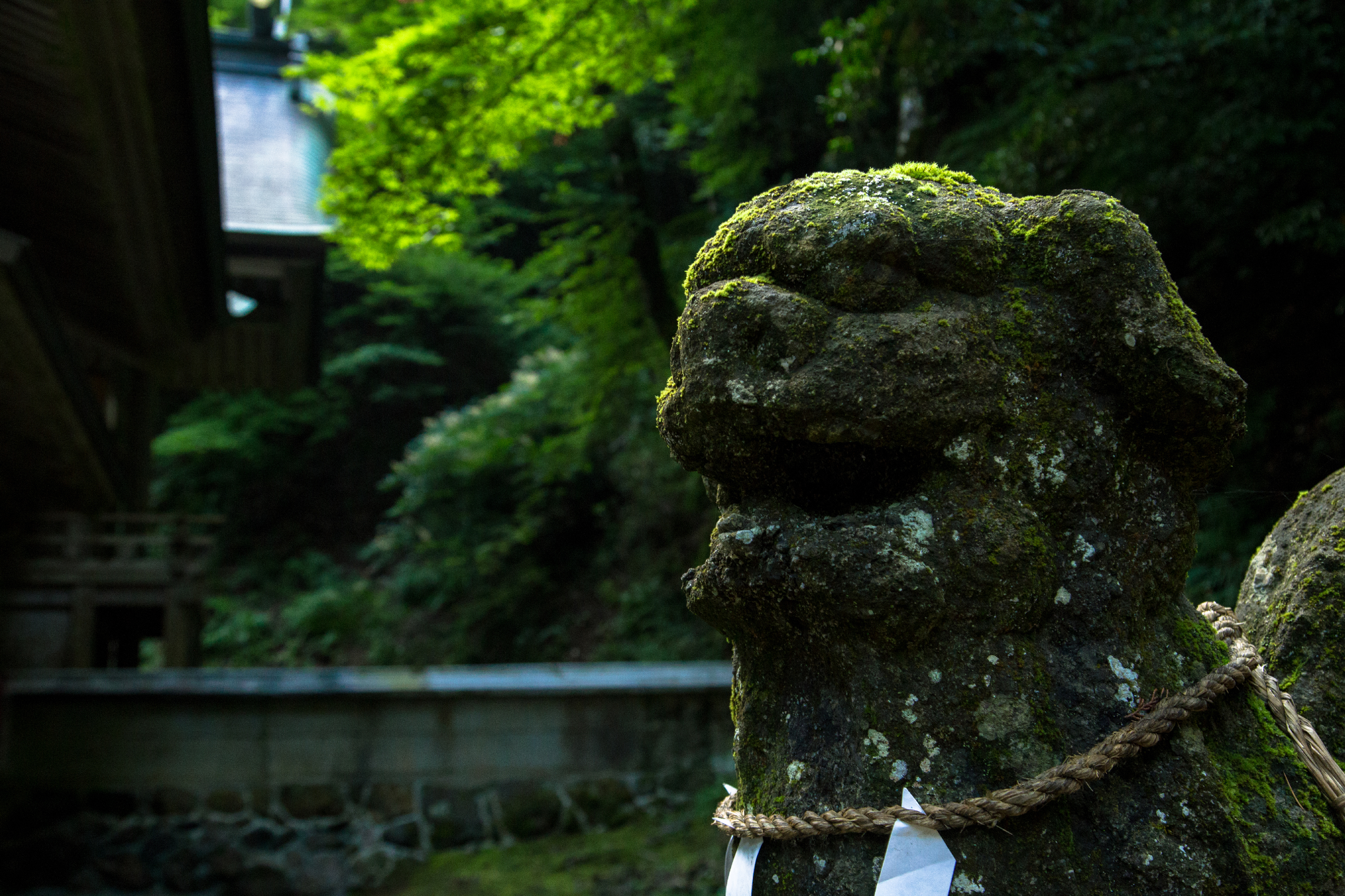 コケに覆われた狛犬_熊野神社