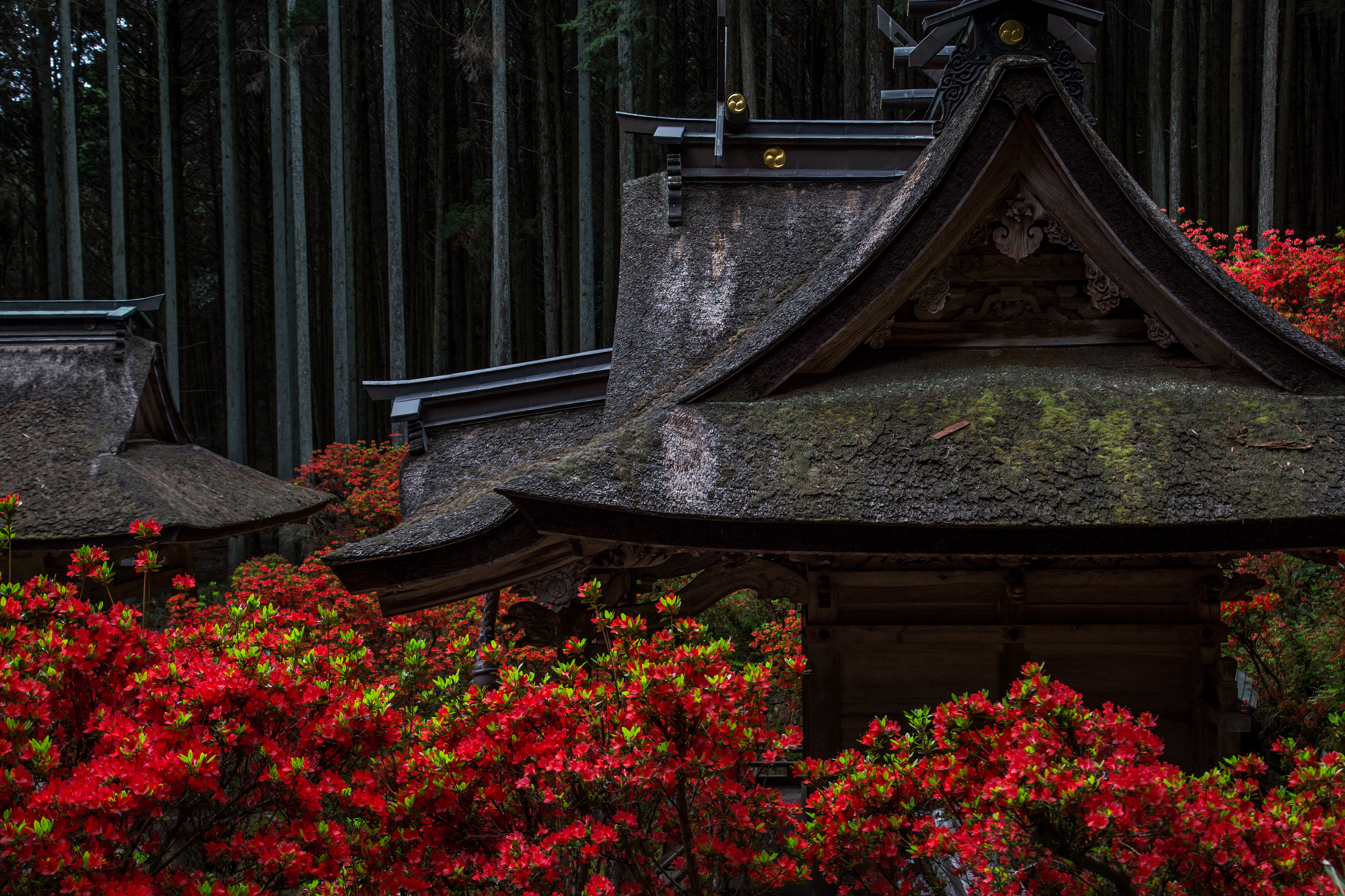 ツツジと茅葺屋根_一宮神社