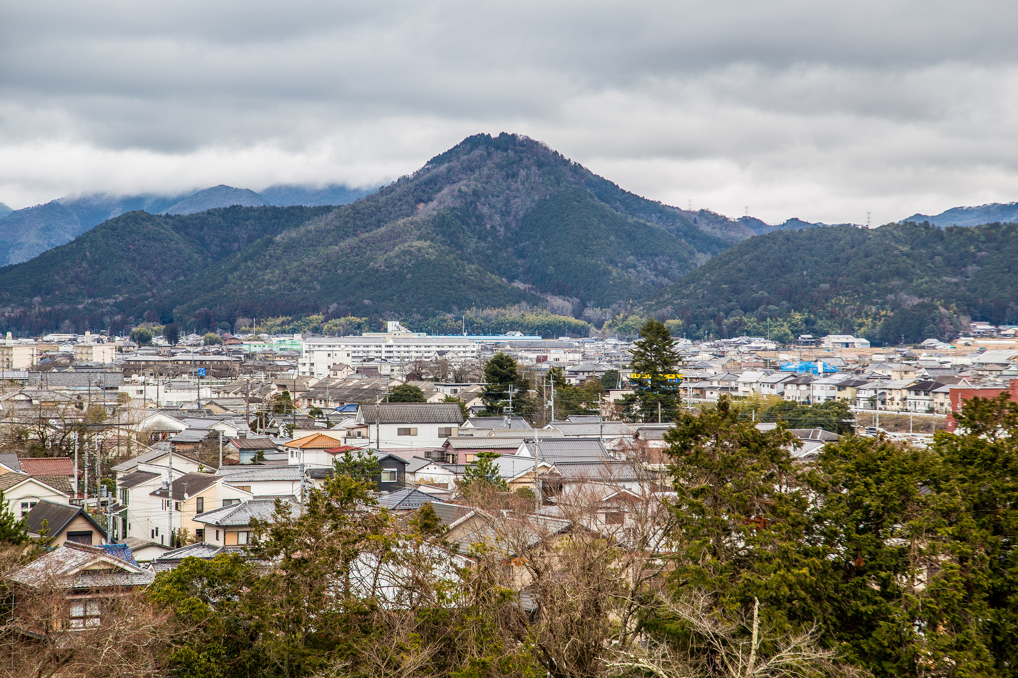 篠山城の天守台から臨む篠山の街並みと八上城跡(高城山)