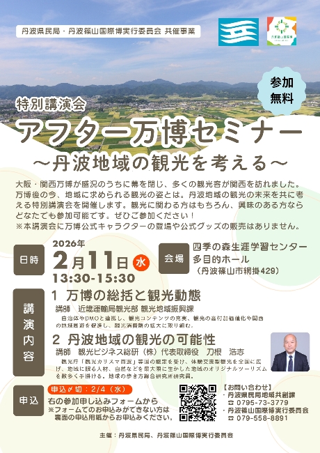 大阪・関西万博が盛況のうちに幕を閉じ、多くの観光客が関西を訪れました。万博後の今、地域に求められる観光の姿とは。丹波地域の観光の未来を共に考える特別講演会を開催します。観光に関わる方はもちろん、興味のある方ならどなたでも参加可能です。