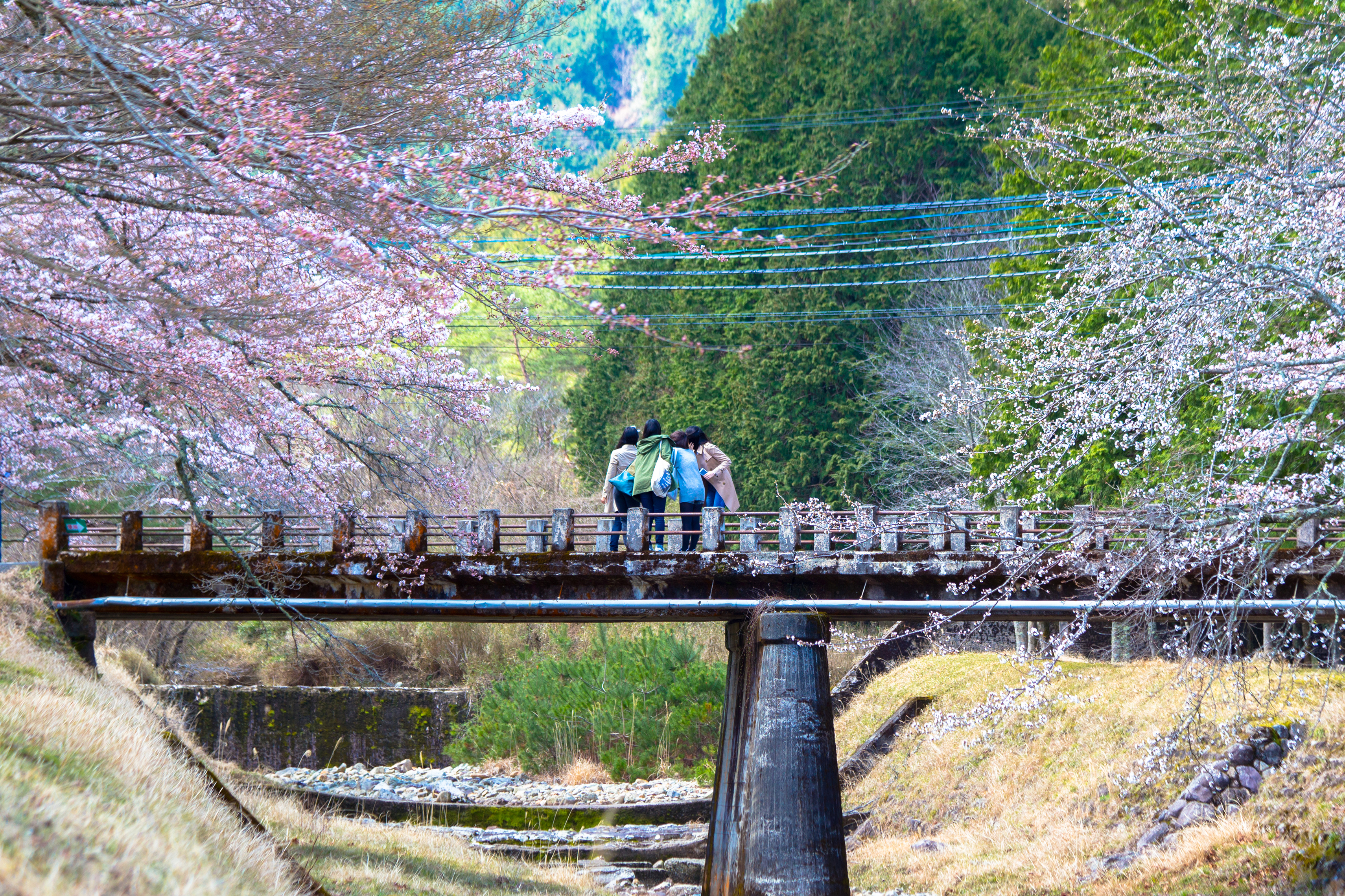 桜をバックに自撮りする女性たち_丹波少年自然の家【営業休止】