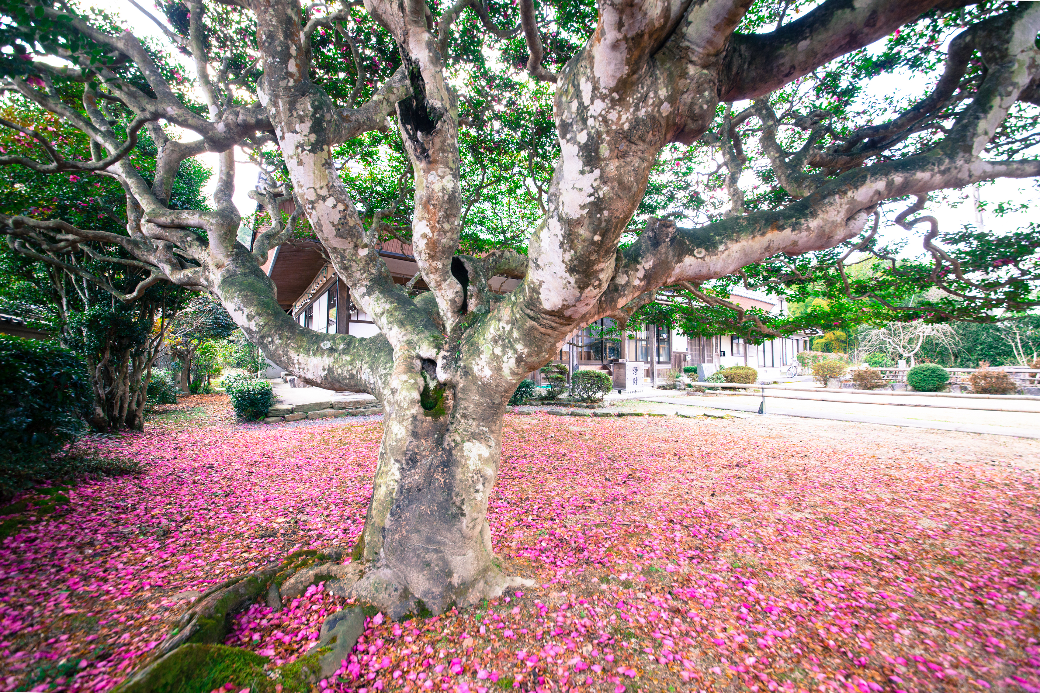 落ちた山茶花がピンク絨毯となっている_西方寺