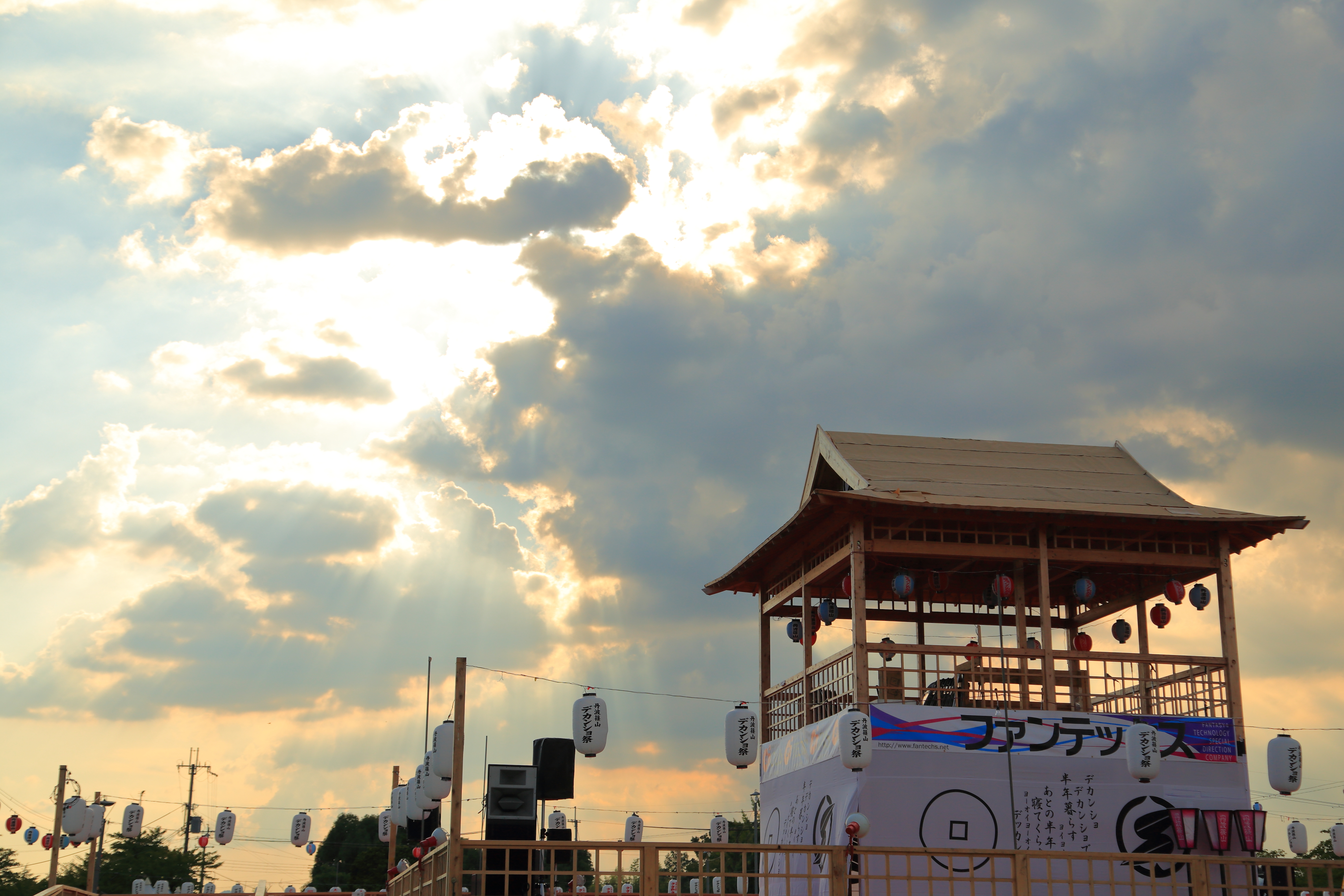 西陽に照らされる櫓_デカンショ祭